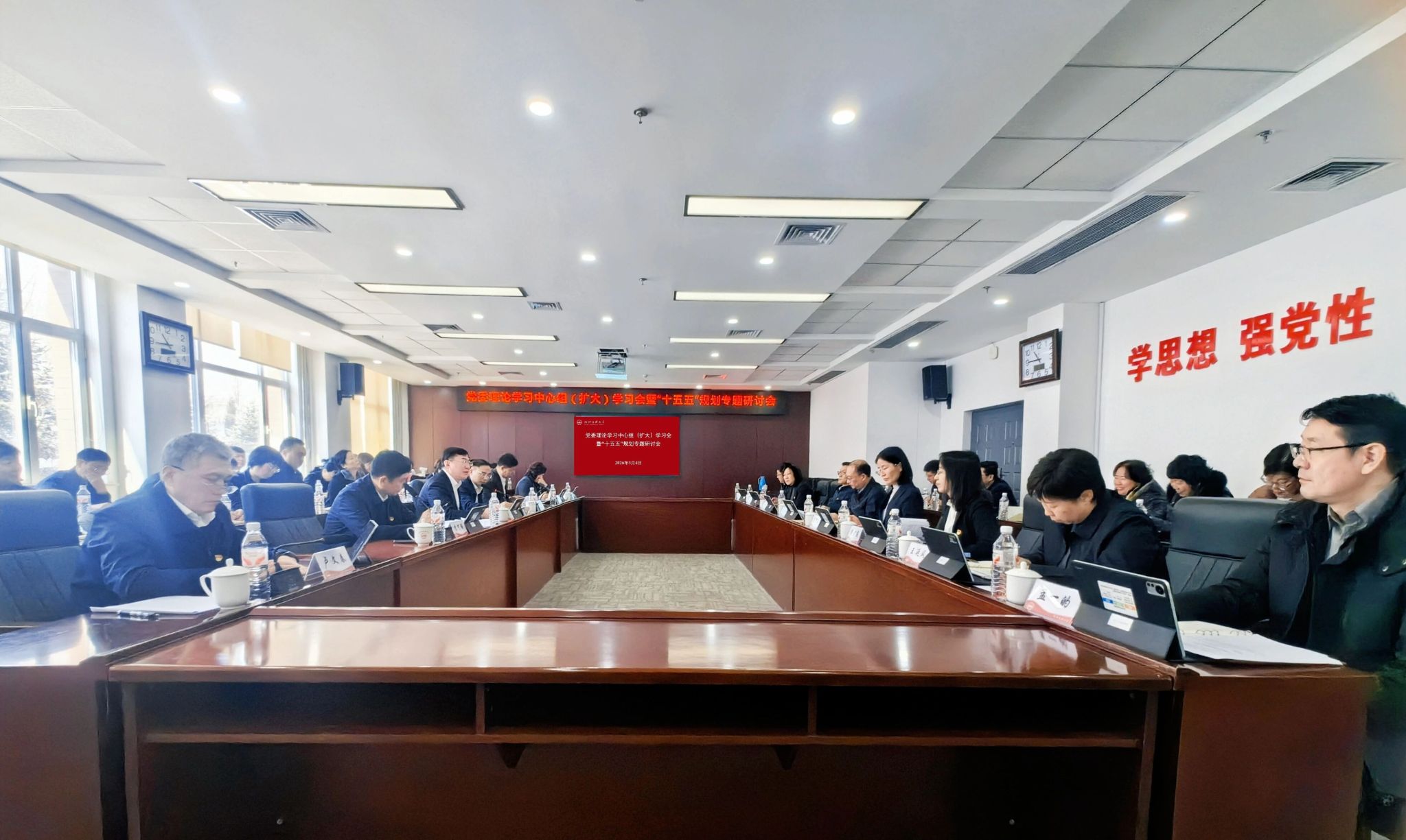 会上,与会同志集中学习贯彻习近平总书记在省部级主要领导干部学习贯彻党的二十届四中全会精神专题研讨班开班式上的重要讲话精神、习近平总书记关于树立和践行正确政绩观的重要论述、习近平总书记关于中医药工作和科技创新的重要论述,深入学习党中央关于中药工业高质量发展的部署以及辽宁省国民经济和社会发展第十五个五年规划要求,并围绕学习内容紧扣学校“十五五”规划编制与实施重点任务进行交流研讨。