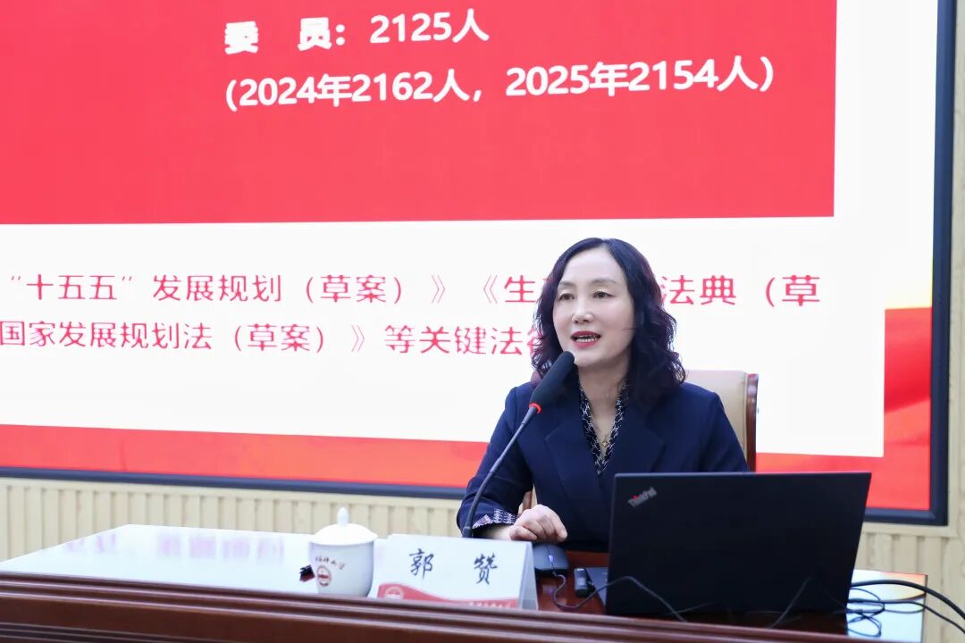 会上,马克思主义学院郭赞教授围绕全国两会精神作专题辅导报告,重点从2026年政府工作报告的核心要义与鲜明特色、教育领域重点部署以及高等教育改革发展方向三个维度,对两会精神进行全面阐释与深度解读。